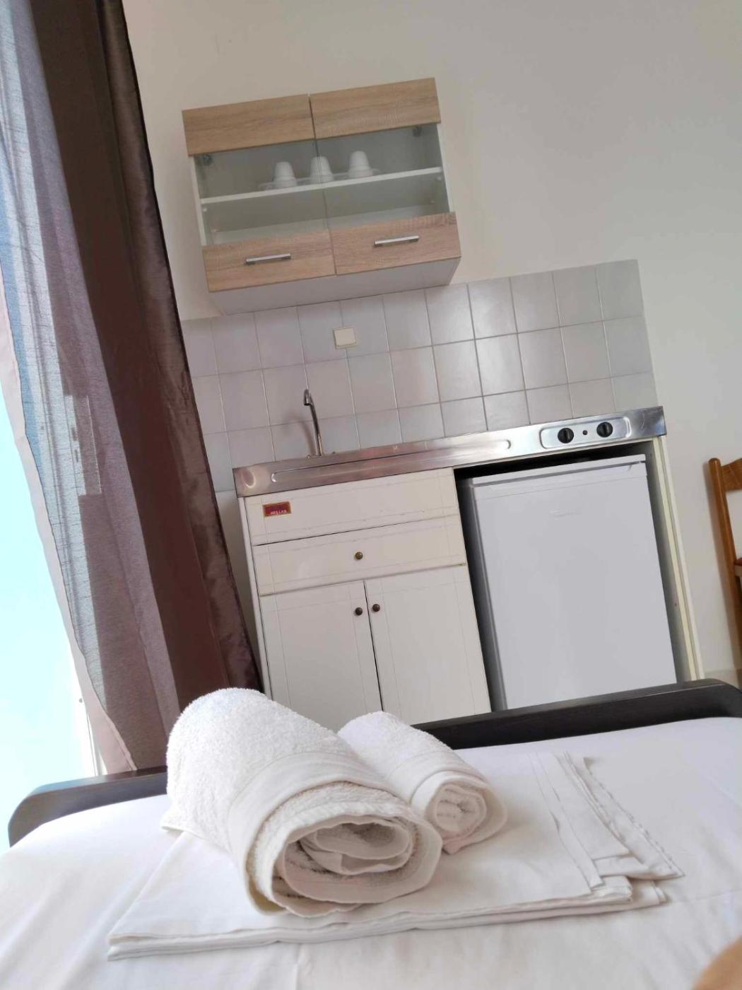 Standard Triple Room. The triple room provides air conditioning, a coffee machine, as well as a private bathroom featuring a bath and a shower. In the well-equipped kitchen, guests will find a stovetop, a refrigerator, kitchenware and a toaster. Boasting a terrace, this triple room also offers a wardrobe, a safe deposit box and a flat-screen TV. The unit offers 3 beds. ;